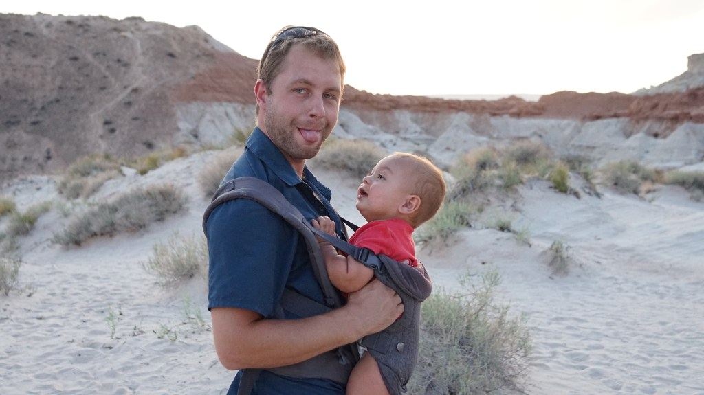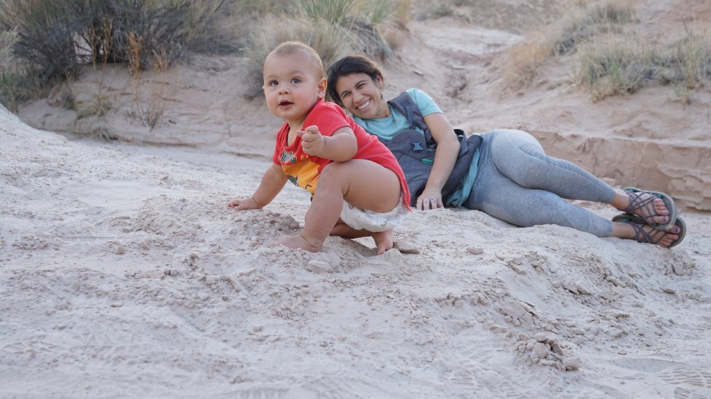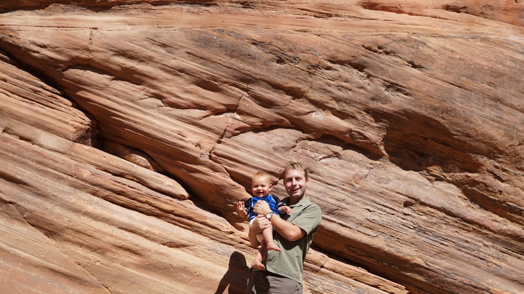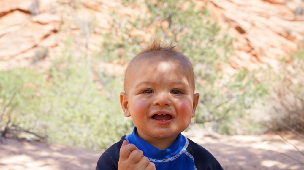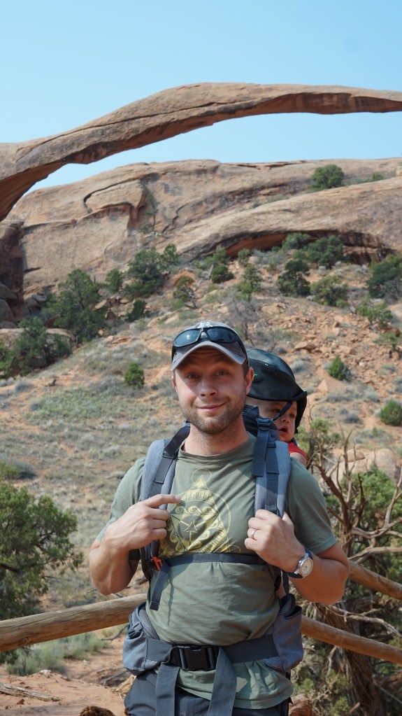 Arches, like Zion, was an incredible experience. It is also massive. We drove to a few of the arch hikes, where we frequently stopped to let our son get out of the backpack and play with the sand that he had recently become fascinated with. It was understandably crowded, but not so much that it bothered us, and we were more concerned about the heat than the crowds. We kept the hikes to the mornings and evenings like before, and made it all the up to Delicate Arch with the little one with only a modest amount of huffing and puffing. I am glad he was in the backpack, though, because there were some seriously steep drop-offs at some points on the trail. He did get fussy at one point and throw his bottle off a cliff, which meant I had to go climbing down after it while my husband laughed at me, but otherwise it was an easy place to bring him.