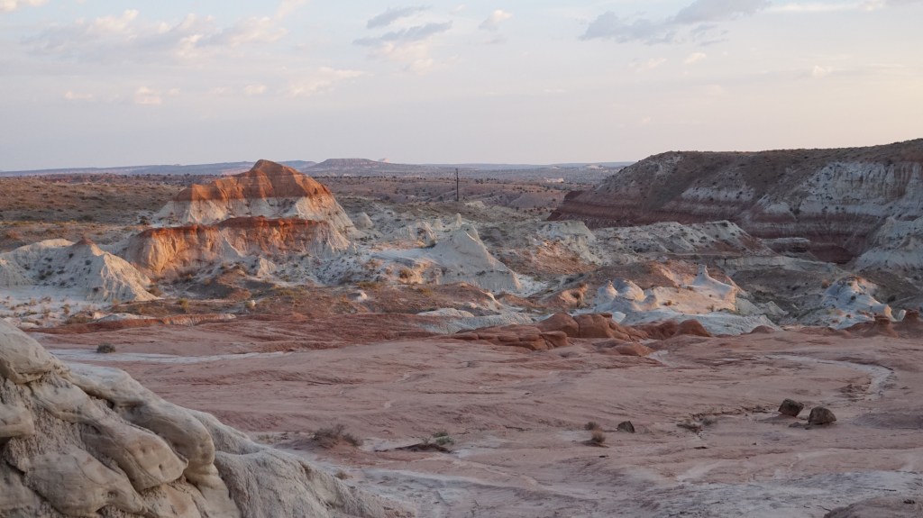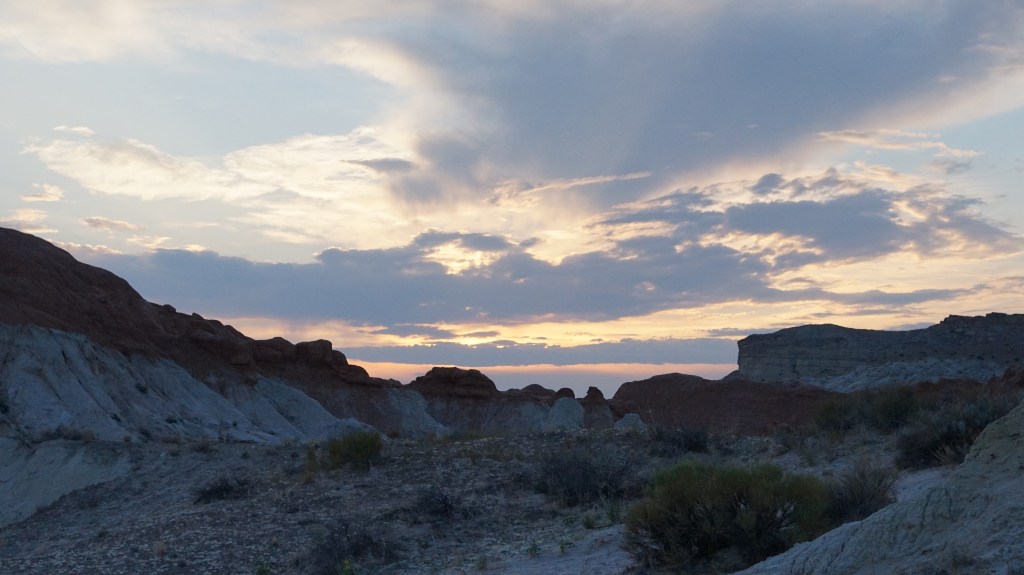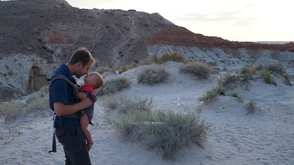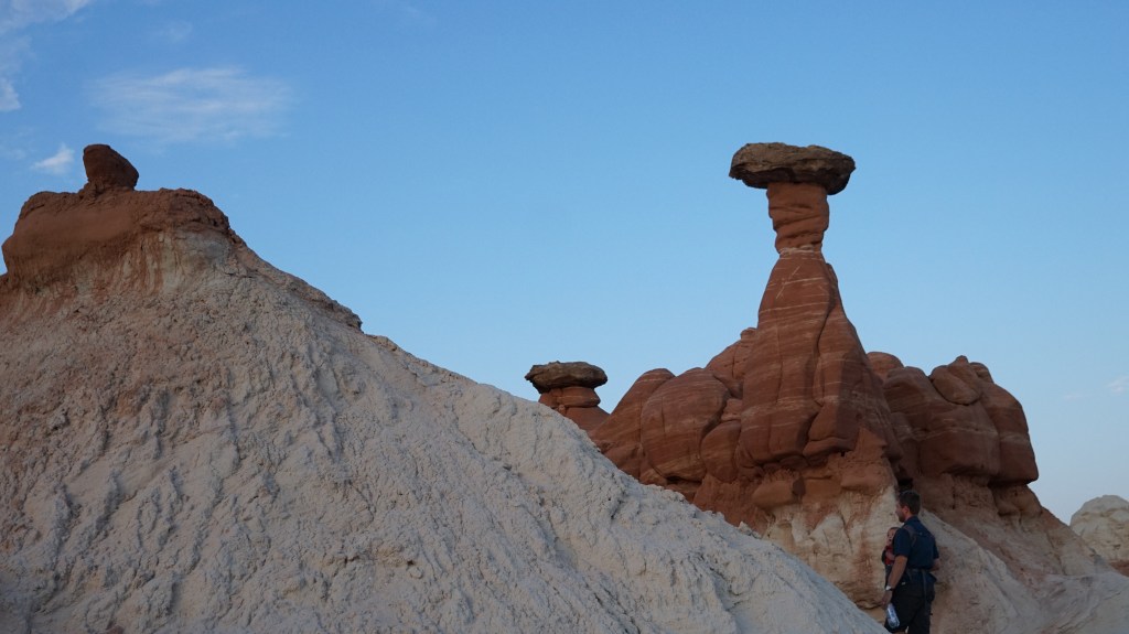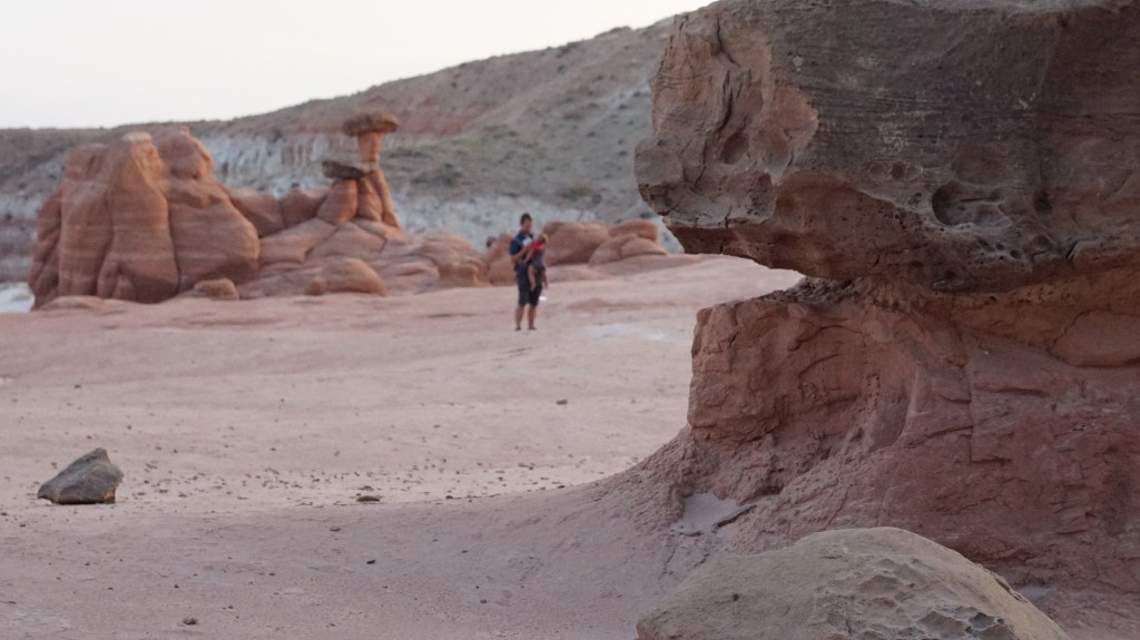 That night we checked out Lone Rock Beach, which is a neat hippy-and-open-space-camping area on the edge of Lake Powell, with a massive rock rising out of an island in the middle of the lake just a few hundred yards away. The next morning we took it easy, and that following evening we did was my husband thinks was the best hike, up to the Toadstools Hoodoos off US Route 89. They are actually across the border back in Utah, and the trail takes you up into the hills where a wild amount of mushroom-shaped rocks stand around at random on a rolling, rock-covered hillside. It was a surreal experience at sunset, and another great place for our son to get out of the backpack and crawl around on his own for a bit.