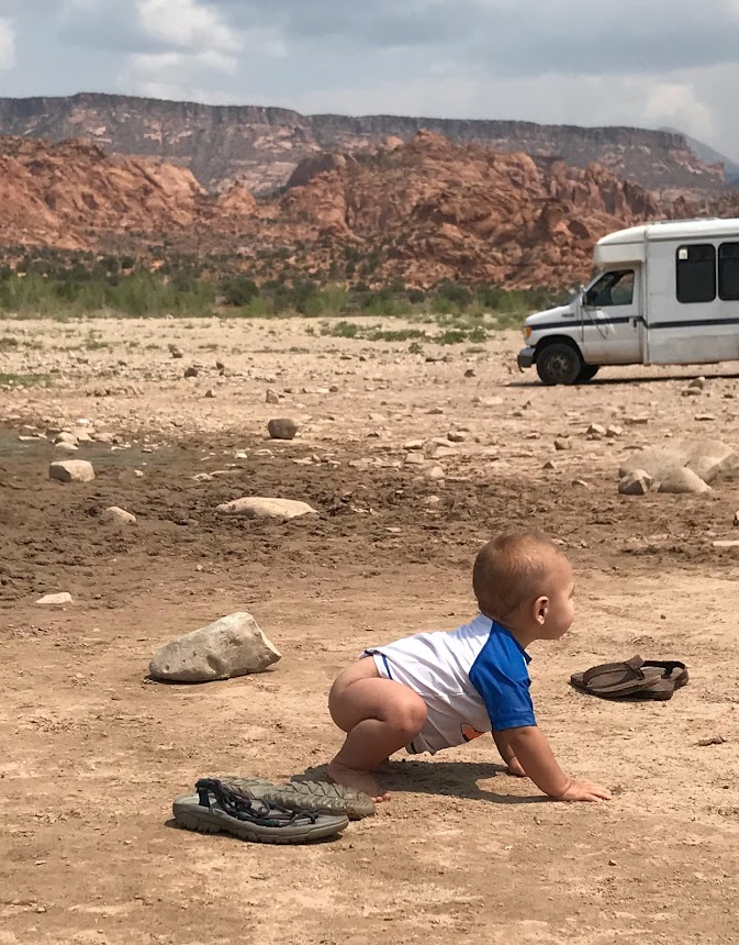 Zion as a national park is breathtaking in its many-colored beauty, with rocks flowing along the roadside in every direction and made up of every variation of red and orange imaginable. The drive through the first time around is absolutely stunning and worthwhile. The park is also unique because visitors can’t drive themselves to most of the trailheads. They instead have to drive through the park to Springdale, UT, and catch a shuttle from there into the main canyon where the best-known hikes originate from. We didn’t know this logistical detail, and didn’t want to bother with it considering our hottest-part-of-the-day and nap-time limitations, so we stuck with what we could access on our own. There are several trails that branch off the one public-access road, including the Canyon Overlook Trail which was amazing at sunset, and some smaller ones close to the Checkerboard Mesa. There are also several pull-offs where you can get out of the car and wander into the brush or down into the dry riverbed, which were great for our little guy to just explore on his own without being able to get into too much trouble. We’re always looking for open spaces like that for him to be himself in, and when we find them we tend to come back frequently.