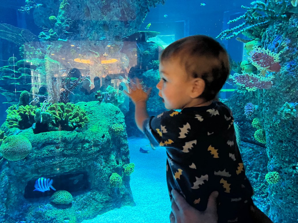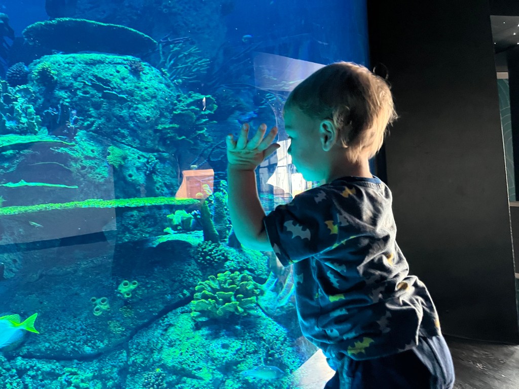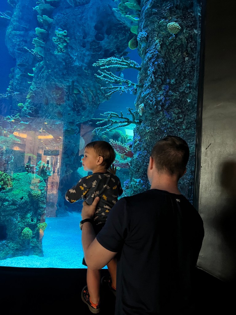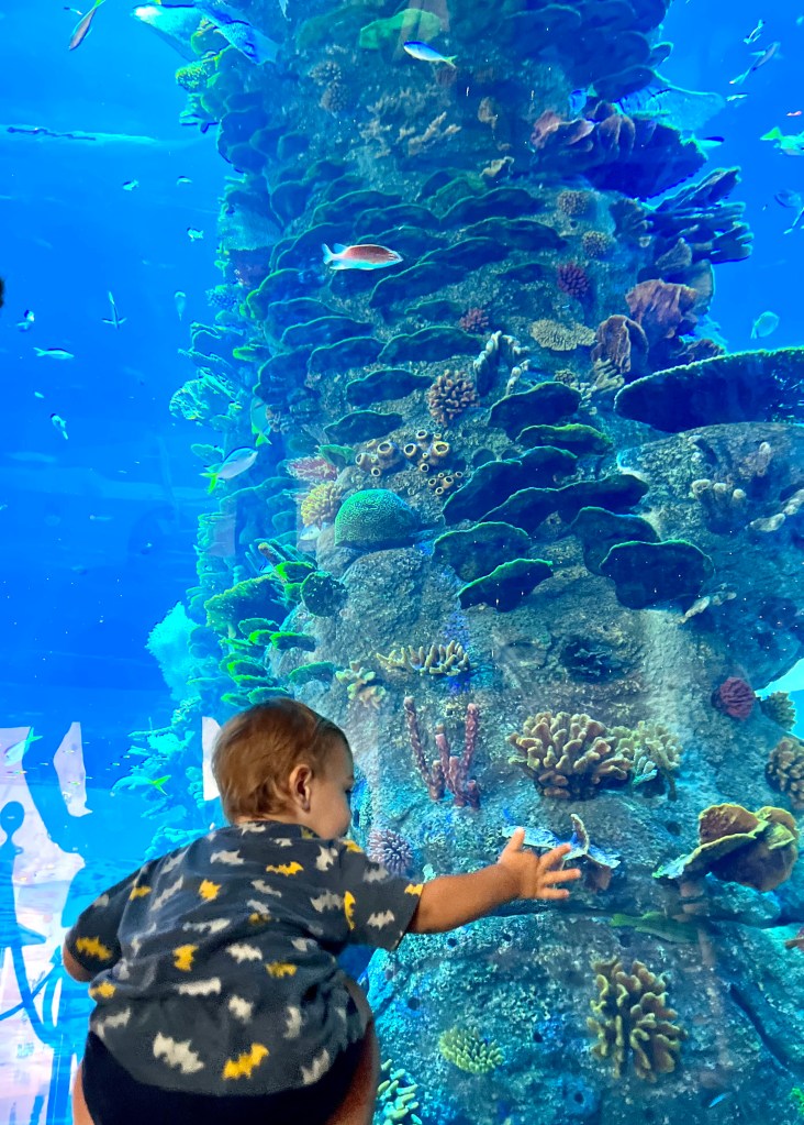 We ventured to Mall of Dilmunia recently, which is basically a giant playground for kids and adults. Because Bahrain is so hot for so much of the year pedestrian gathering places often move inside. These malls are different than malls at home in the U.S. For example- At this mall, there are rock walls, fountains, trampolines, an arcade, an ice skating rink, super hero statues, a kids train, and Milo’s favorite… aquarium walls! We spent to much time admiring the fish(ies) that span three floors and laughing at Milo’s fish face.